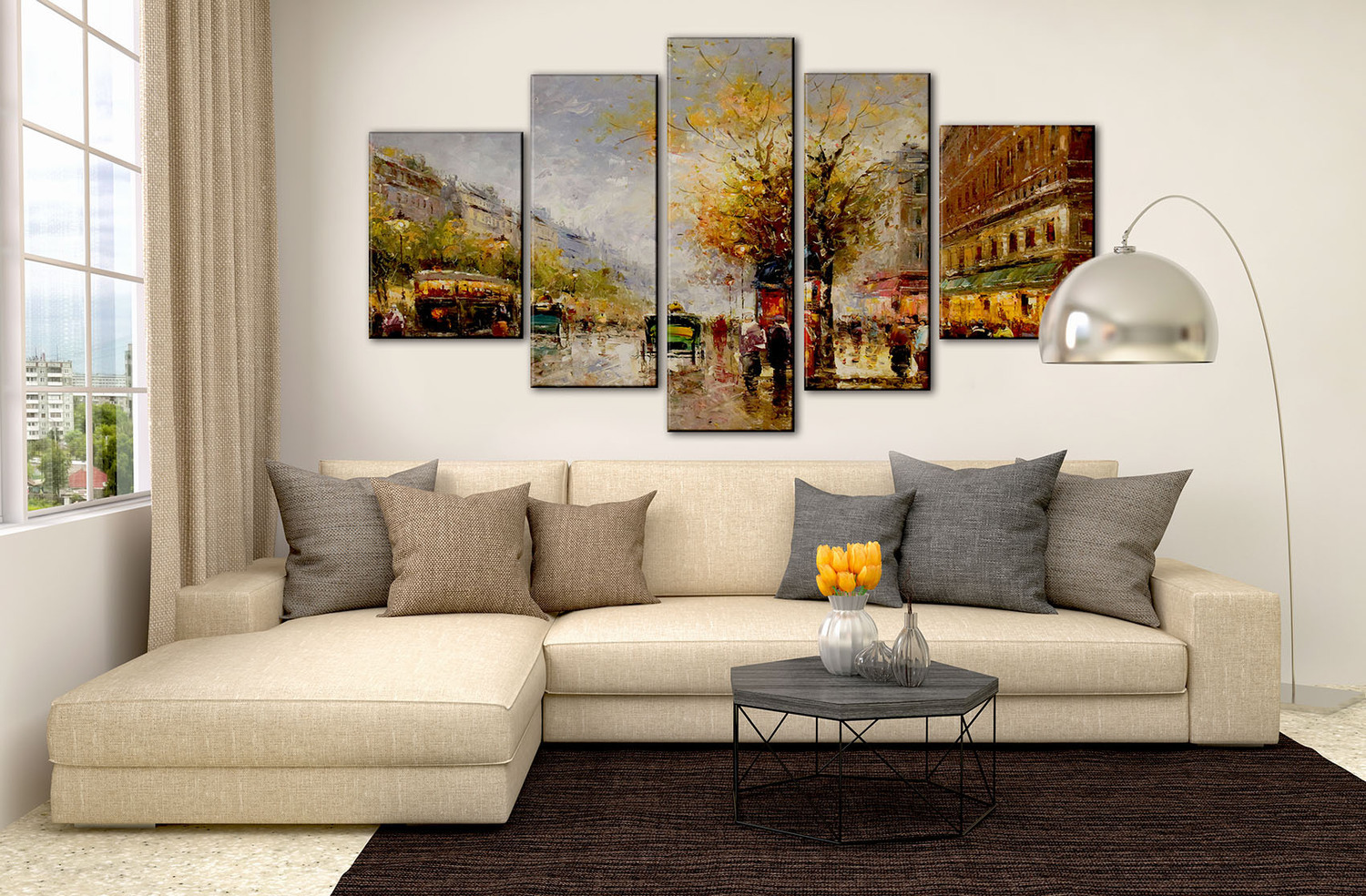 В центр следует поместить нечто особенно интересное и привлекательное. Картины меньшего размера располагают над более крупными. Желательно, чтобы интерьерные полотна были выполнены в одной технике, иначе велик риск, что отдельные части будут привлекать больше внимания. В этом плане универсальным и доступным для каждого решением являются напечатанные картины. При покупке таких картин важно проверить их качество: стойкость краски, качество рамы и другие нюансы.