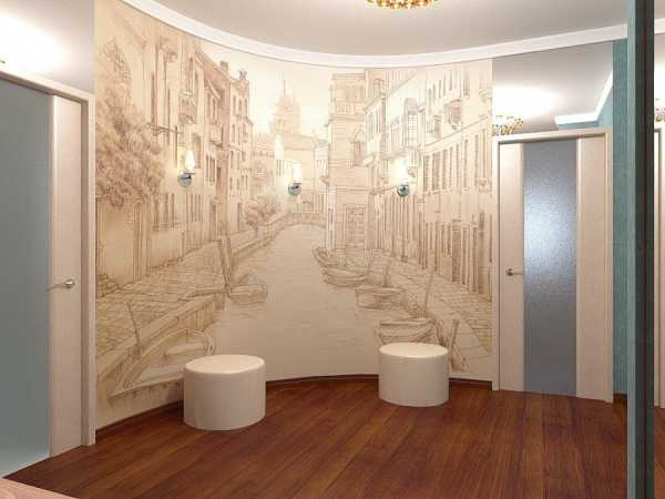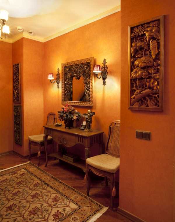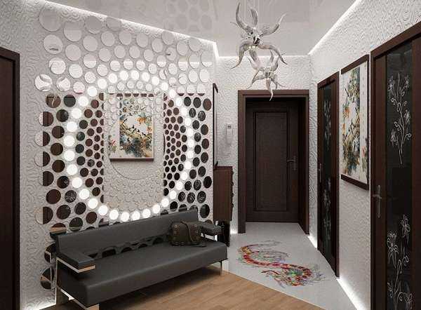 Если его размеры маленькие, то композиции из нескольких картин будет достаточно. Интересным вариантом для панно на стену будет зеркальный его вид. Разместить несколько отражающих поверхностей по периметру коридора, которые будут создавать причудливый орнамент. Не обязательно зеркала, можно и соответствующие пленки необычной формы, с неровностями, например.