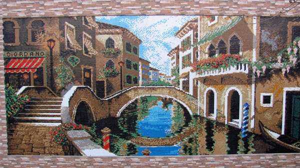 В просторных гостиных композицию рекомендуют размещать по всей длине стеновой глади, состоять она может из нескольких элементов, связанных между собой едины сюжетом. Отличным вариантом станет большой корабль, бороздящий морскую гладь, который вышит на тканевом полотне.