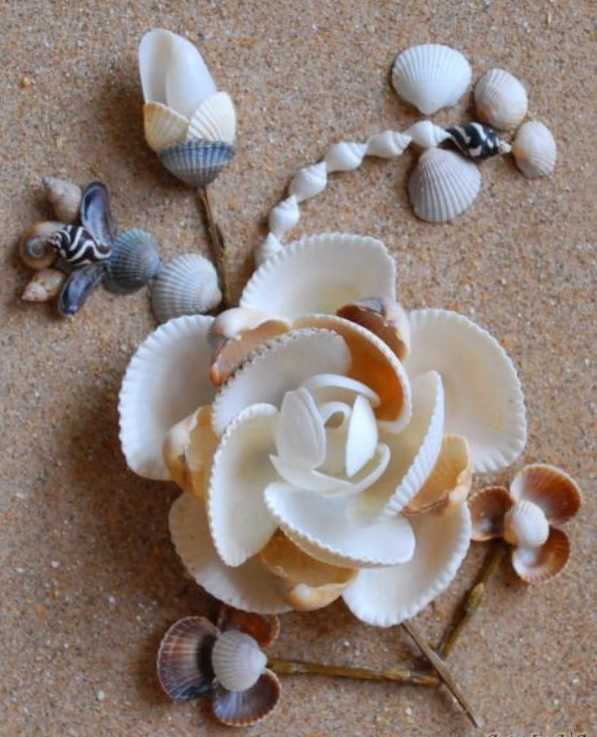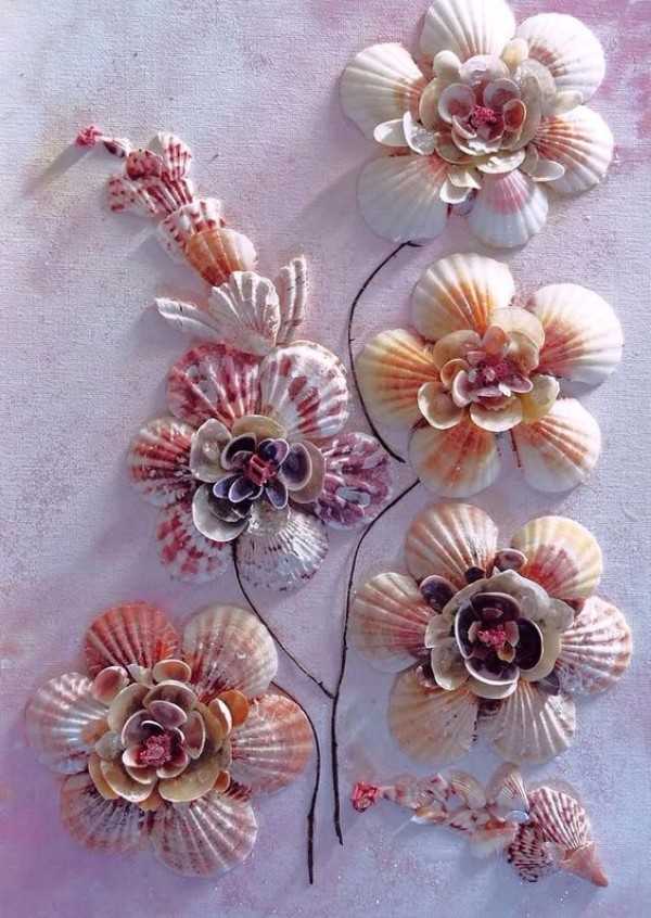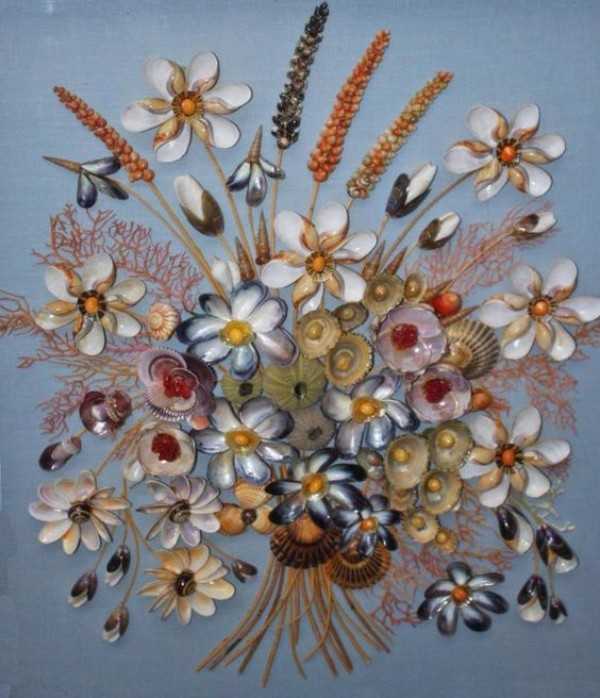 Панно, как и художественные картины, могут иметь разнообразные сюжеты. Например, панно из ракушек может изображать пышный букет, который, как видно на фото, будет выглядеть очень реалистично и объемно. Для этого ракушкам лучше придать с помощью красок различные оттенки. Изначально подбираются подходящие по размеру ракушки, из которых формируются бутоны, а затем и серединки. В качестве стеблей можно использовать толстую нить либо ряды бусин.