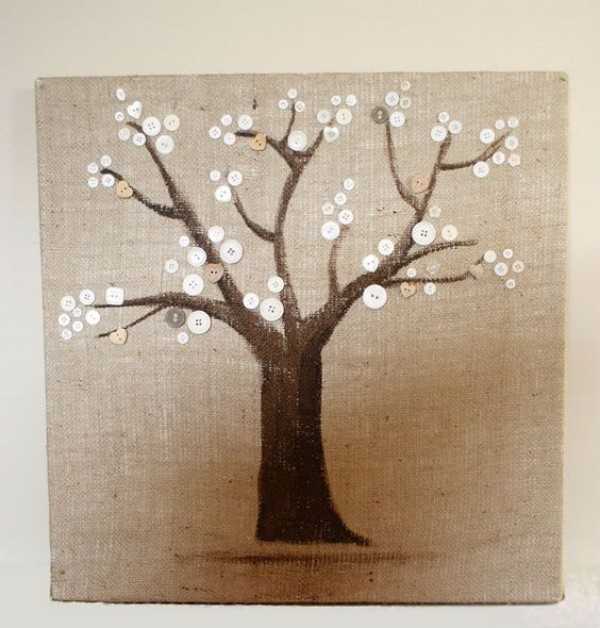 У многих хозяек наверняка есть целые шкатулки с различными пуговицами, оставшимися после сношенных вещей. Они могут так и лежать годами, не находя себе применения, как ненужный хлам, который жалко выбросить. А ведь приложив немного фантазии и креатива, можно сделать из них красивейшее настенное панно своими руками. Например, используя наименее востребованные, зеленые и коричневые пуговицы различных оттенков, можно создать чудесное «денежное» дерево, как показано на фото. При этом, из подручных материалов необходимы только доска, клей и карандаш для зарисовки эскиза. Все это имеется в любом хозяйстве, так что оформление такого панно своими руками не повлечет материальных затрат.