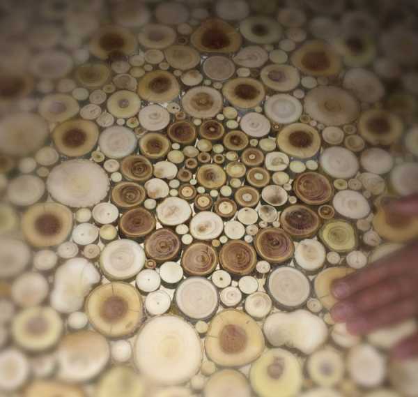 Изначально изготавливается рамка. Здесь потребуется дополнительный инструмент — стусло, который позволяет отрезать заготовки под углом 45 градусов. Готовая рамка крепится на основу с помощью мелких гвоздей или степлера. Затем нарезаем из веток пятаки, причем толщина может быть разной.