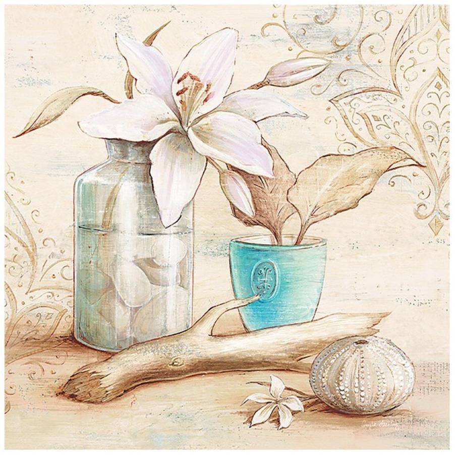 Эти обрамленные репродукции напоминают витражи старого мира и воплощают в себе стиль французского кантри. Выполнены в модных оттенках синего и бежевого, которые подчеркнуты овсяными льняными ковриками.