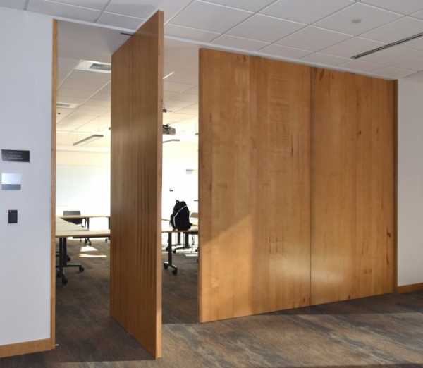 Нестандартно будет смотреться и рото-дверь. Для того, чтобы закрыть такую, придется потянуть за нее как за обыкновенную распашную дверь, а затем сдвинуть полотно в бок. Когда полотно находится в открытом состоянии, оно стоит поперек коробки, при этом одна половина двери расположена внутри, а другая – снаружи помещения.