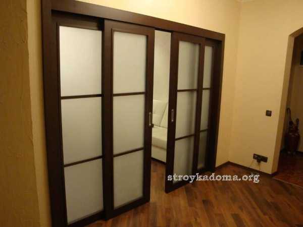 Коль мы говорим именно о квартирах, то в них можно часто видеть двери-купе. В таком случае дверное полотно двигается по специальным рельсам, которые закреплены на поверхности пола и потолка. Существуют модели с разным количеством створок. Работа этих дверей тихая и мягкая.