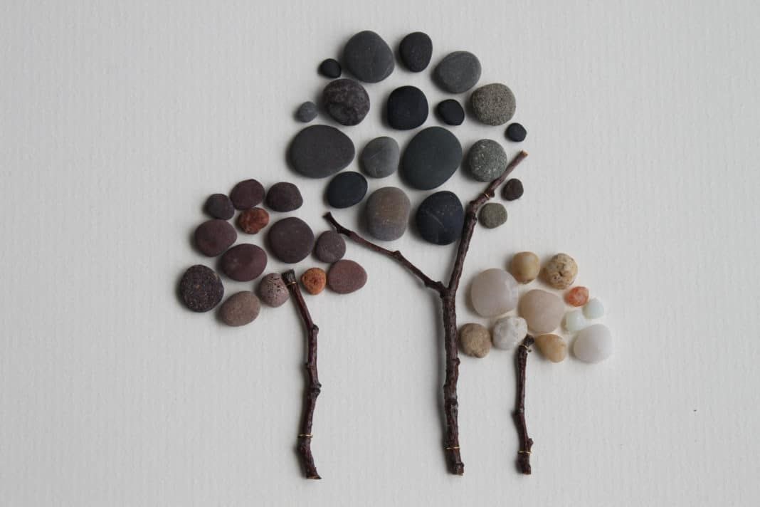 Начните размещать камешки меньшего размера по краям ветки, чтобы они напоминали листья.
