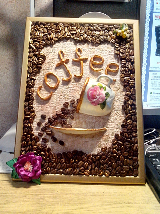 Ингредиенты, которые необходимы для создания таких необычных поделок, всегда есть под рукой. Кофейные зерна можно приобретать недорогих марок, это существенно уменьшит цену поделки.