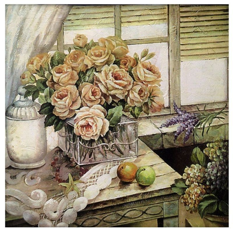 Лаванда – «визитная карточка» Прованса, поэтому полотна с ней всегда будут беспроигрышным вариантом. Наряду с лавандой нередко применяют изображения роз, но не красных, а приглушенных бежевых, пудровых. Картины с розами украсят спальню молодой девушки, семейной пары. Во многих случаях цветы изображаются в старых вазах, треснувших от времени кувшинах.