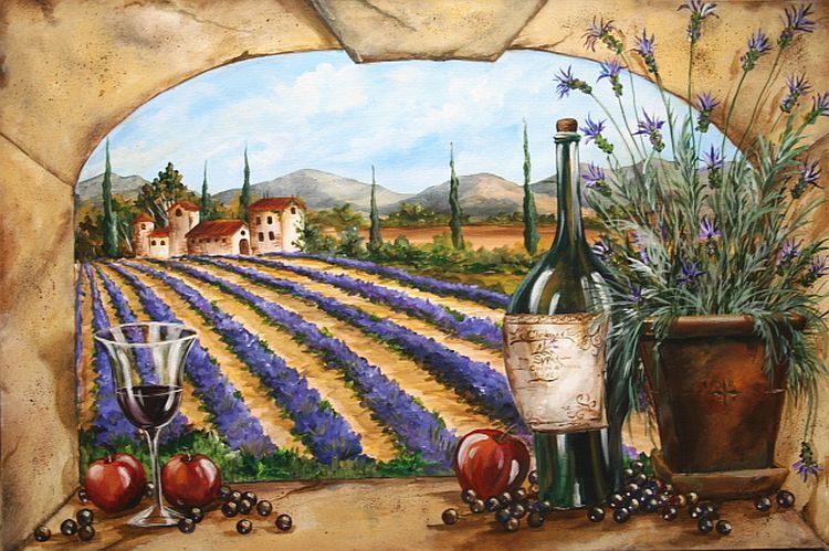 Также распространенным способом оформления стен является роспись акриловыми красками. Популярны растительные мотивы, навеянные природой средиземноморья: виноградные лозы и гроздья, плющ и пр. Обычно росписью украшают участок, на котором нужно акцентировать внимание — зону камина, или изголовье кровати.