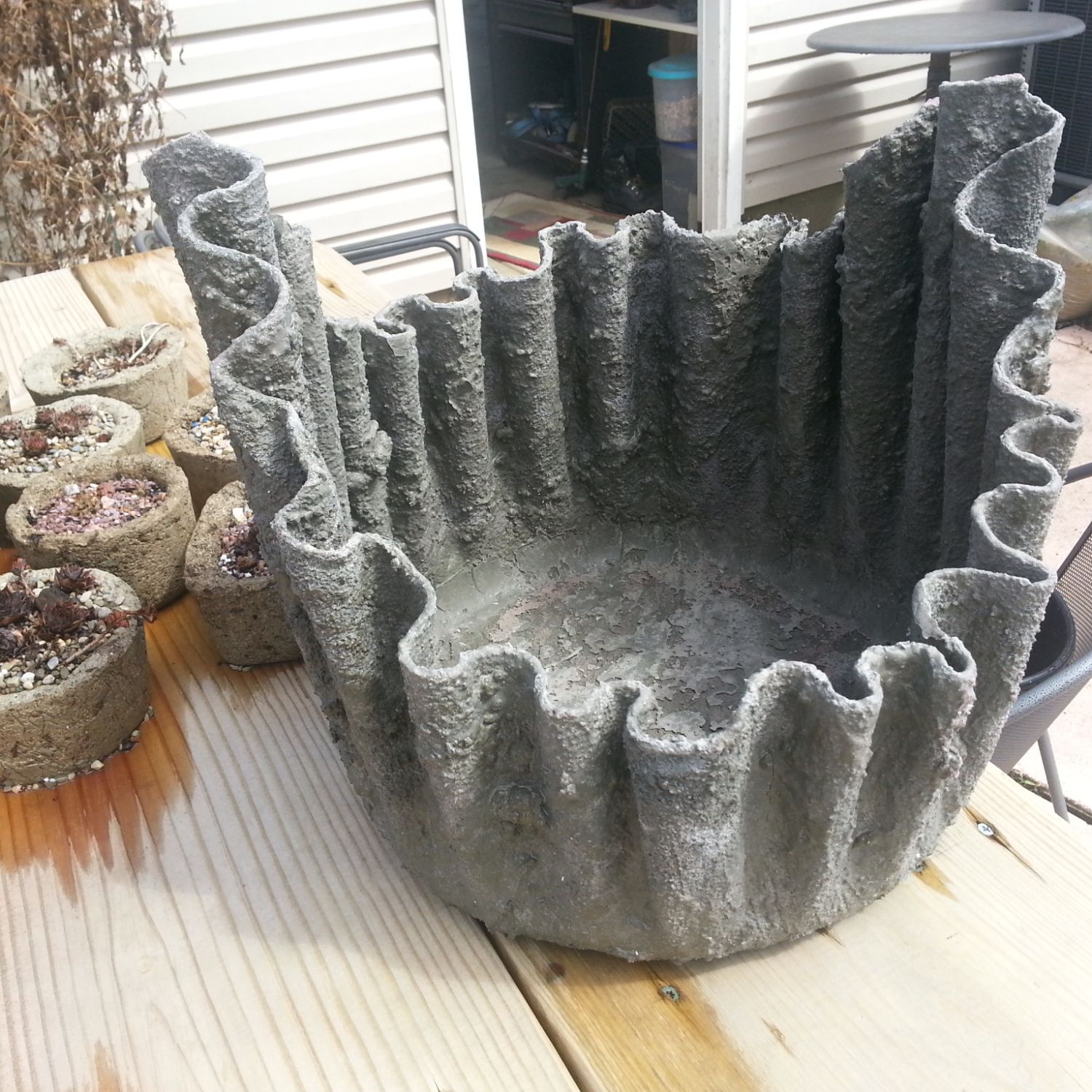 Используя различные металлические каркасы в форме ведра или другой тары, можно сделать заготовки для кашпо из полимерного гипса или цемента. Выбранный сосуд нужно обвести металлической проволокой, затем снять получившуюся сетку и покрыть ее в несколько слоев полосками ткани, смоченной в растворе.