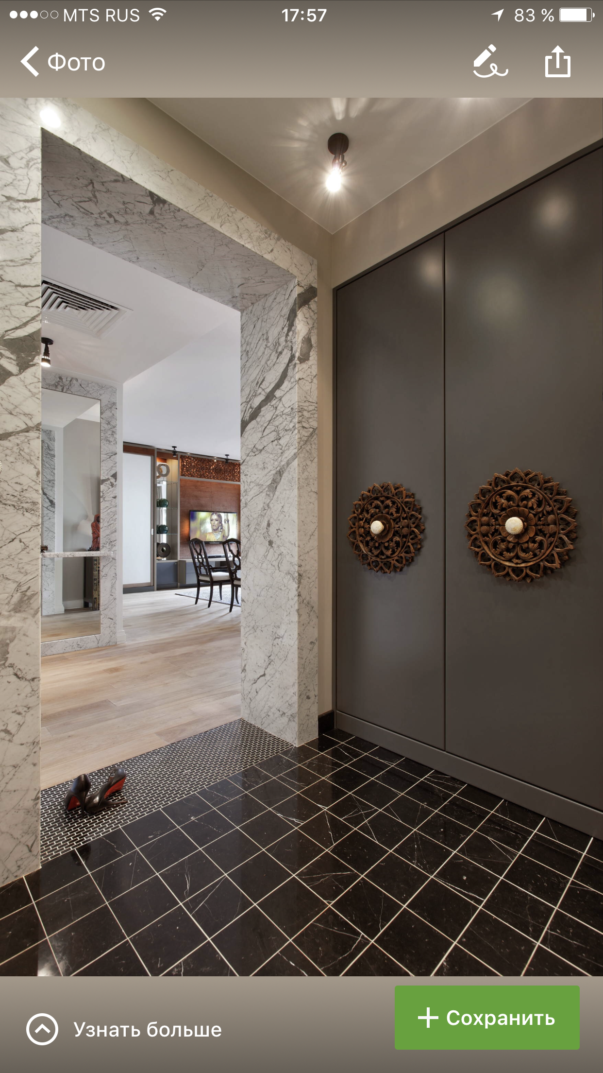 Плитка с эффектом мрамора используется для создания уюта и комфорта. С помощью подобного рисунка можно создать эффект узорного ковра в прихожей.