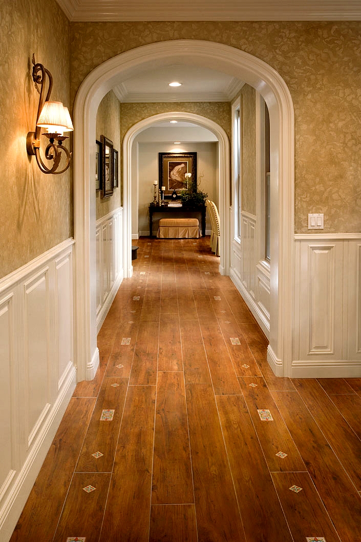 Если основным является классический стиль, то лучше всего использовать плитку с имитацией под дерево. Также удачно смотрится рисунок под натуральный камень. Подобные решения создают в помещении особую атмосферу тепла, уюта и гармонии. Керамогранит может применяться в качестве центрального элемента – пол полностью застилается материалом, а также выступать, как элемент декора в помещении (отделка производится частично). В последнем случае нужно подобрать подходящие для зонирования материалы. Такой вариант идеален для прихожих с большой площадью (в коттеджах, особняках).