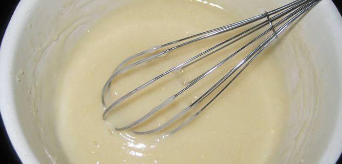 - Одновременно с этим на плите доводится до кипения вода в количестве 3-х частей. Как только вода закипит, а в маленькой миске разойдутся все крахмальные комки, содержимое последней выливается в кипящую воду, и смесь осторожно взбивается венчиком.