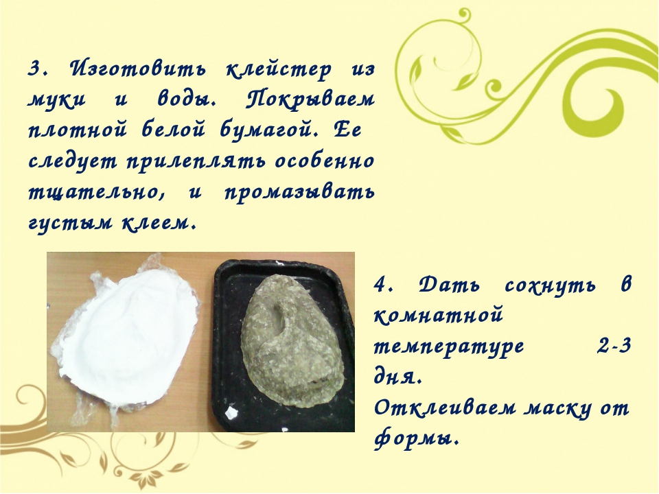 и пахнет за короткое время. Но даже в этом случае лучше всего хранить все продукты в герметичных контейнерах или пакетах для заморозки в холодильнике (не забывайте их маркировать) и делать небольшие количества свежих, а не большие партии. Мука и водный клей, вареныеВскипятите в кастрюле 5 стаканов воды.Отдельно в миске смешать 1/4 стакан просеянной муки с стаканом холодной воды. Смешайте до однородной консистенции (это немного похоже на заварной крем или белый соус), и когда все комки исчезнут, добавить смесь в воду в кастрюле. Осторожно кипятить, непрерывно помешивая в течение 2-3 минуты, пока смесь не загустеет. Дайте остыть перед использованием. Вы можете сделать более густой клей (который быстрее высыхает), добавив 1 стакан муки на каждые 3 стакана воды. Вернуться к началу. Мучная паста, сыраяСмешайте 1/2 стакана белой муки и 2/3 стакана воды до образования пасты кремообразной консистенции. Добавьте воду по каплям или муку по чайной ложке, чтобы улучшить консистенцию и избежать комков. Несколько капель масла перечной мяты были предложены в качестве консерванта, предотвращающего рост плесени. Вернуться к началу. Краска вареная Осторожно нагрейте 1 стакан муки и 2 стакана воды в сковороде на слабом огне при постоянном помешивании до загустения. Вернуться к началу. Тесто для лепки, приготовленноеСначала вам нужно собрать следующие ингредиенты: