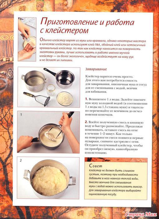 Рекомендуемые пропорции для приготовления небольшой порции клейстера – 100 г муки, пол-литра воды, 2-е столовые ложки ПВА. В кипящую воду добавляют муку, варят и вымешивают смесь в течение 5 минут. После полного остывания подливают ПВА, взбалтывают.