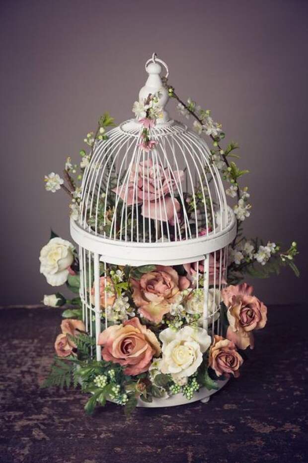 Декор интерьера птичьими клетками сегодня очень актуален. А еще старинные птичьи клетки покупают креативные флористы — чтобы создать невероятно романтические композиции. Этот несложный декор непременно привлечет внимание гостей и будет радовать взгляд даже в самые скучные дни. Таким способом можно оформить как свежесрезанные цветы, так и садовые цветущие растения. Кроме того, клетка будет отлично смотреться и в роли подсвечника, обрамленного цветами.