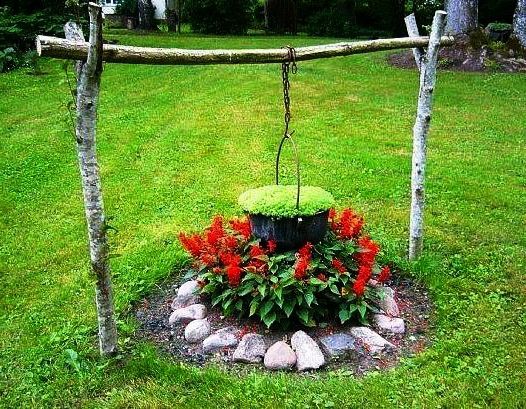 В отличии от идеи для клумб из подручных материалов, в данном случае необходимо придумать оригинальную композицию и оформить ее с помощью цветов.