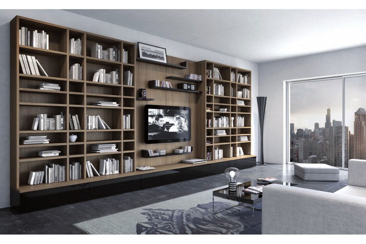 Функциональный современный интерьер характеризуется максимально удобными открытыми стеллажами или модульными изделиями с четкими линиями в яркой, глубокой или натуральной цветовой гамме.