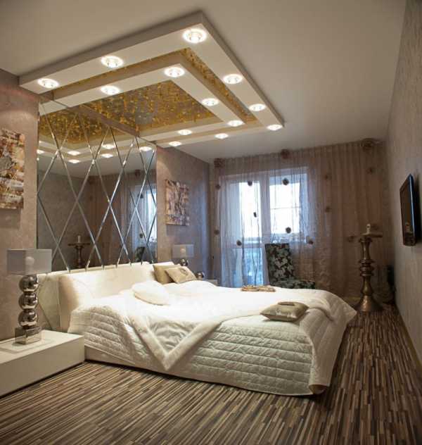 - Потолок. Современные потолки вполне сочетаются с другими средствами? корректирующими пространство. Многоуровневые конструкции использовать можно достаточно интересно. Но при высоте комнаты до 2,8 м это не оправданно. Тяжеловесность конструкции отразится на дизайне. Окрашенные и натяжные потолки – правильное решение для спальни. Отражающим эффектом, а, следовательно, визуально добавляющим объема, обладают глянцевые поверхности. В данном случае зрительно увеличивается высота комнаты. Натяжные глянцевые потолки не обязательно должны быть белыми. Разнообразные светлые оттенки поддержат общую концепцию и придадут комнате шарм.