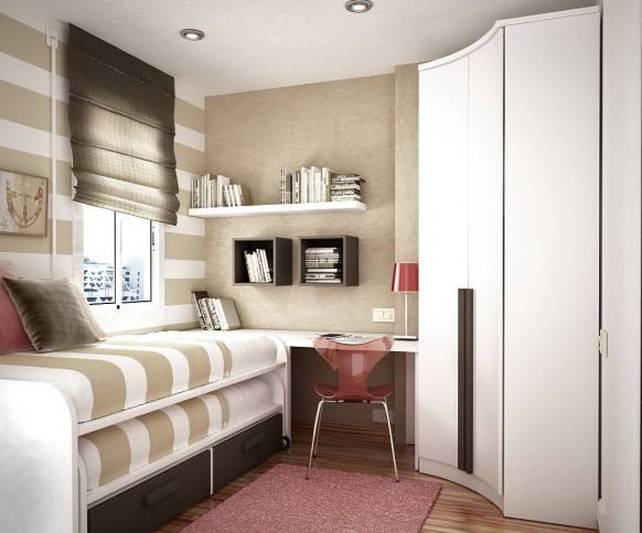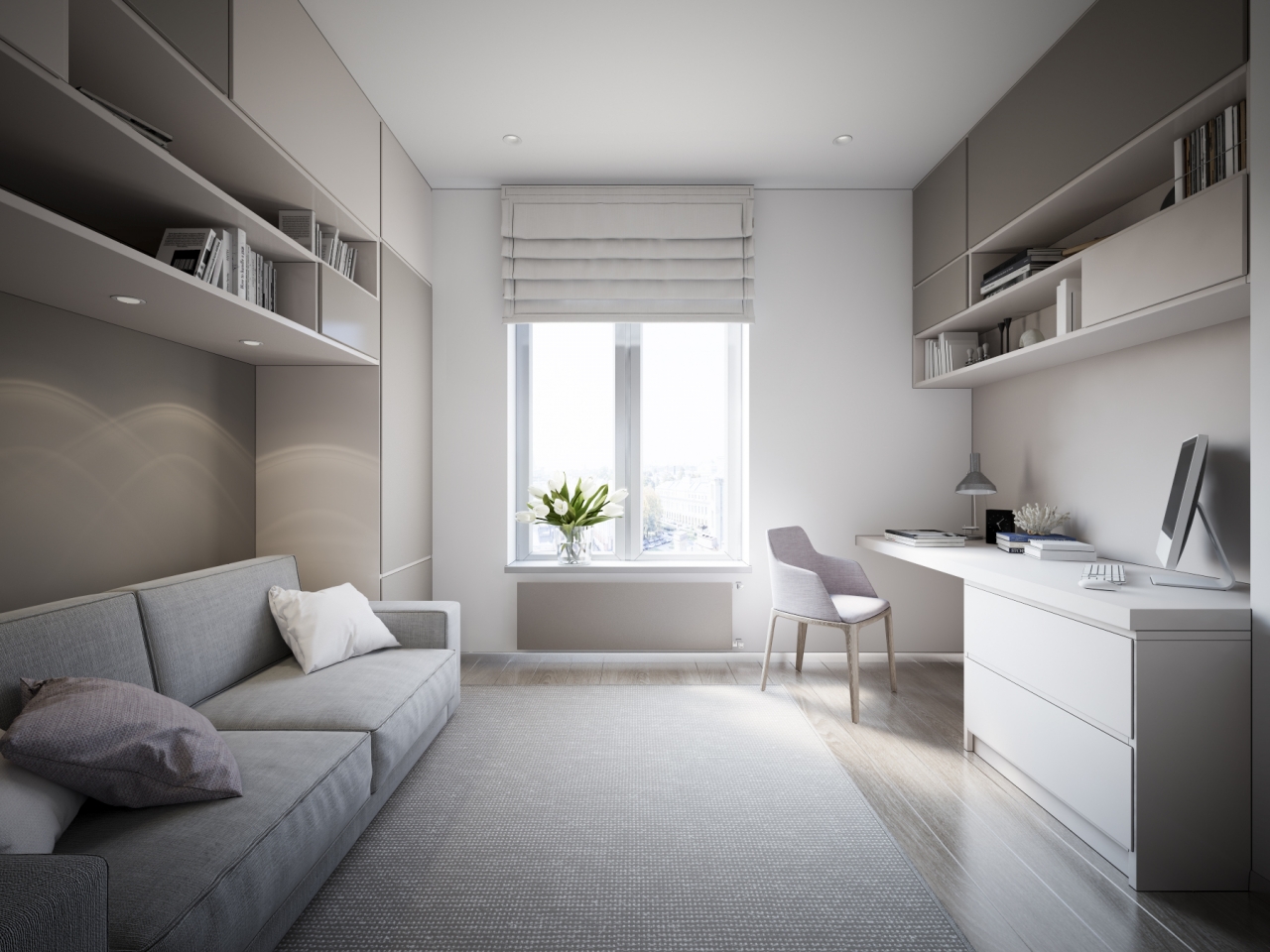 В первом случае рабочее место располагается в углу и является со спальней одним целым. Кровать ставят возле окна, напротив стола. Помимо этого, можно создать маленький кабинет, отделив рабочую зону декоративной перегородкой или стеллажом.