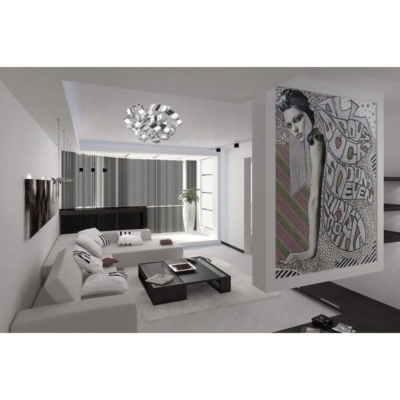 Цветовая гамма близка к стилю хай-тек, а оформление – к минимализму. Нет вычурных, кричащих деталей. Зато есть функциональные предметы. Комнату можно зонировать при помощи мобильных перегородок. Приветствуется асимметрия в отделке или расположении предметов.