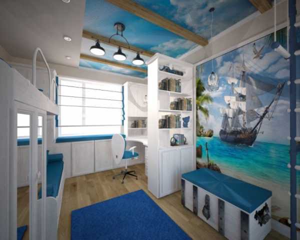 Распространенный вариант интерьера. Здесь используйте любые цвета морской тематики. Главное – решить какой именно будет основным. Что касается основного материала, должно быть именно дерево. Например, пол из паркетных досок, на стены — панели из дерева. Мебель должна соответствовать основному стилю. Кровать можно заказать например, в виде корабля со штурвалом или обычной лодки, а стол лучше всего – из деревянной доски.