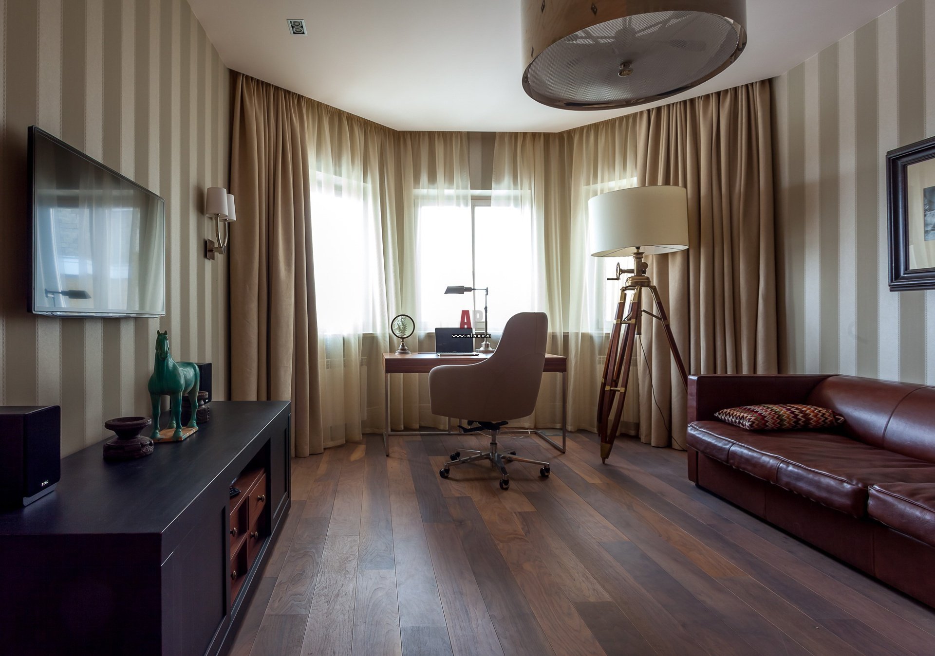 Иногда они могут свободно свисать, но чаще их фиксируют прихватами, выполненными в стиле интерьера дома. - При устройстве в эркере кабинета, лучше всего остановить свой выбор на классических римских или рулонных шторах, а также на горизонтальных жалюзи по размеру окна. Главное предусмотреть, чтобы их было удобно закрывать и открывать.