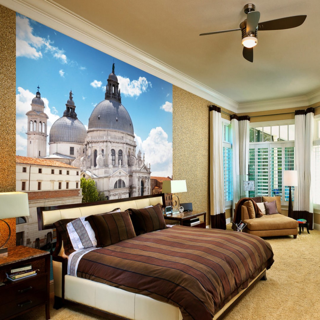 Для дизайна маленькой спальни фотообои выбирают перспективные или панорамные. Если такую композицию разместить напротив входа в комнату, пространство покажется бесконечным.