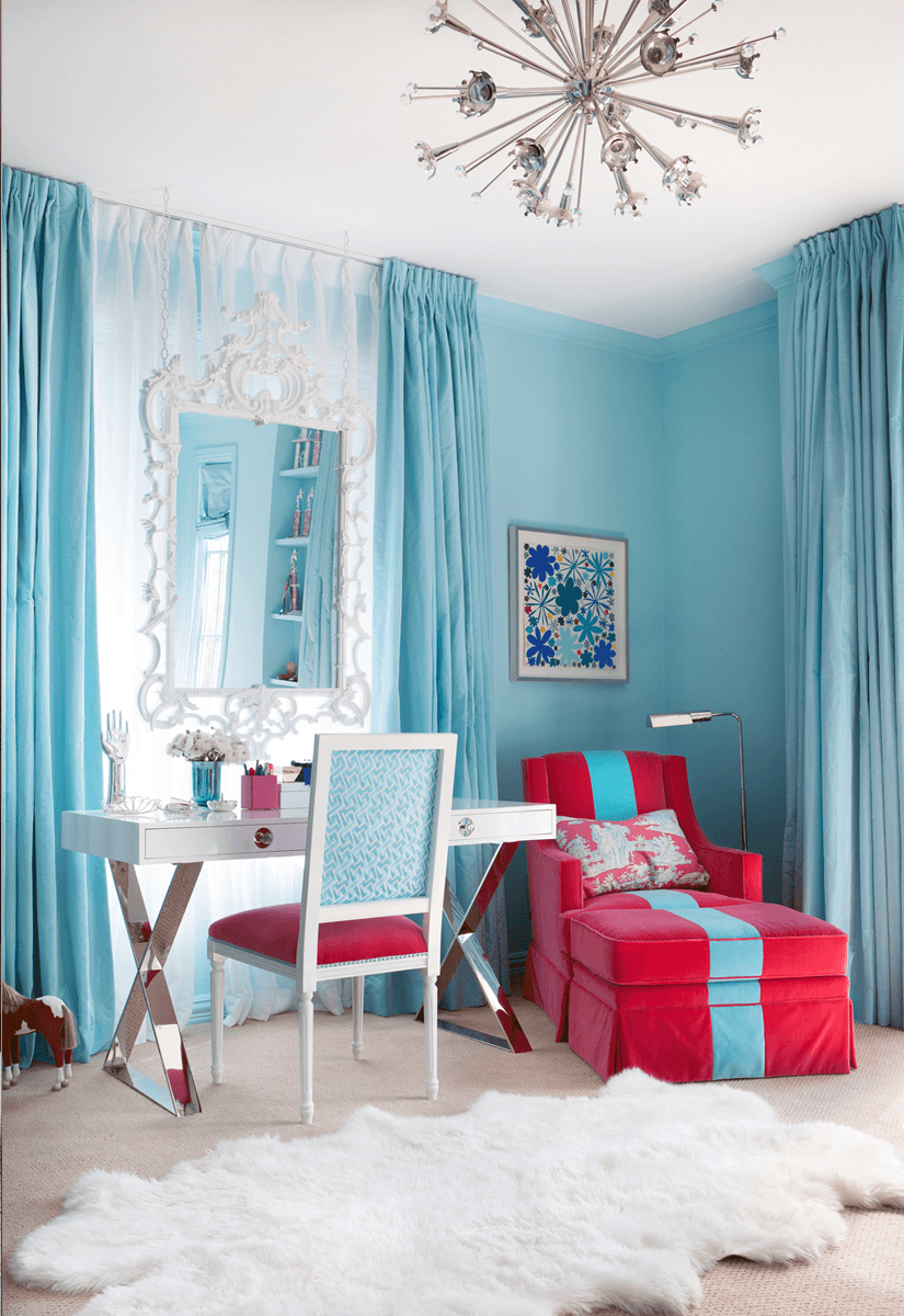 Можно оклеить в ярко- или бледно-голубой цвет. Также голубым можно оформить только зону отдыха, сочетая с бледно-оранжевой рабочей зоной. Традиционно голубые оттенки встречаются в комнате мальчиков, но если его сочетать с белым и розовым, то такой вариант подойдет и для спален девочек.