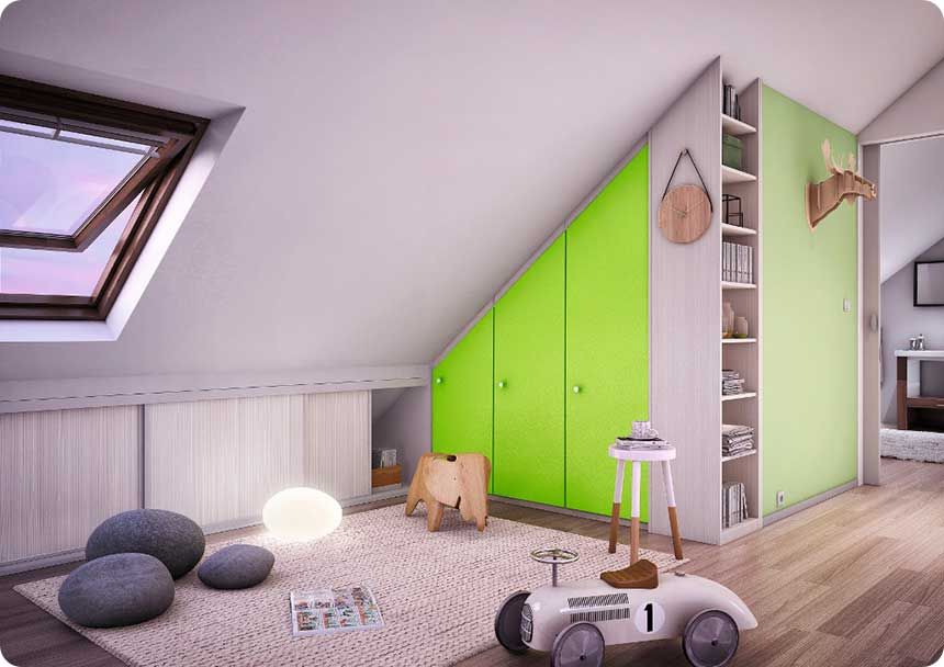 Для экономии пространства используются выдвижные полки или настенные стеллажи. Можно позаботиться о раздвижной кровати, служащей одновременно местом и для сна, и для хранения постельных принадлежностей или других вещей. В узкой нише под скосом стены удобно разместятся небольшие стеллажи для книг или игрушек.