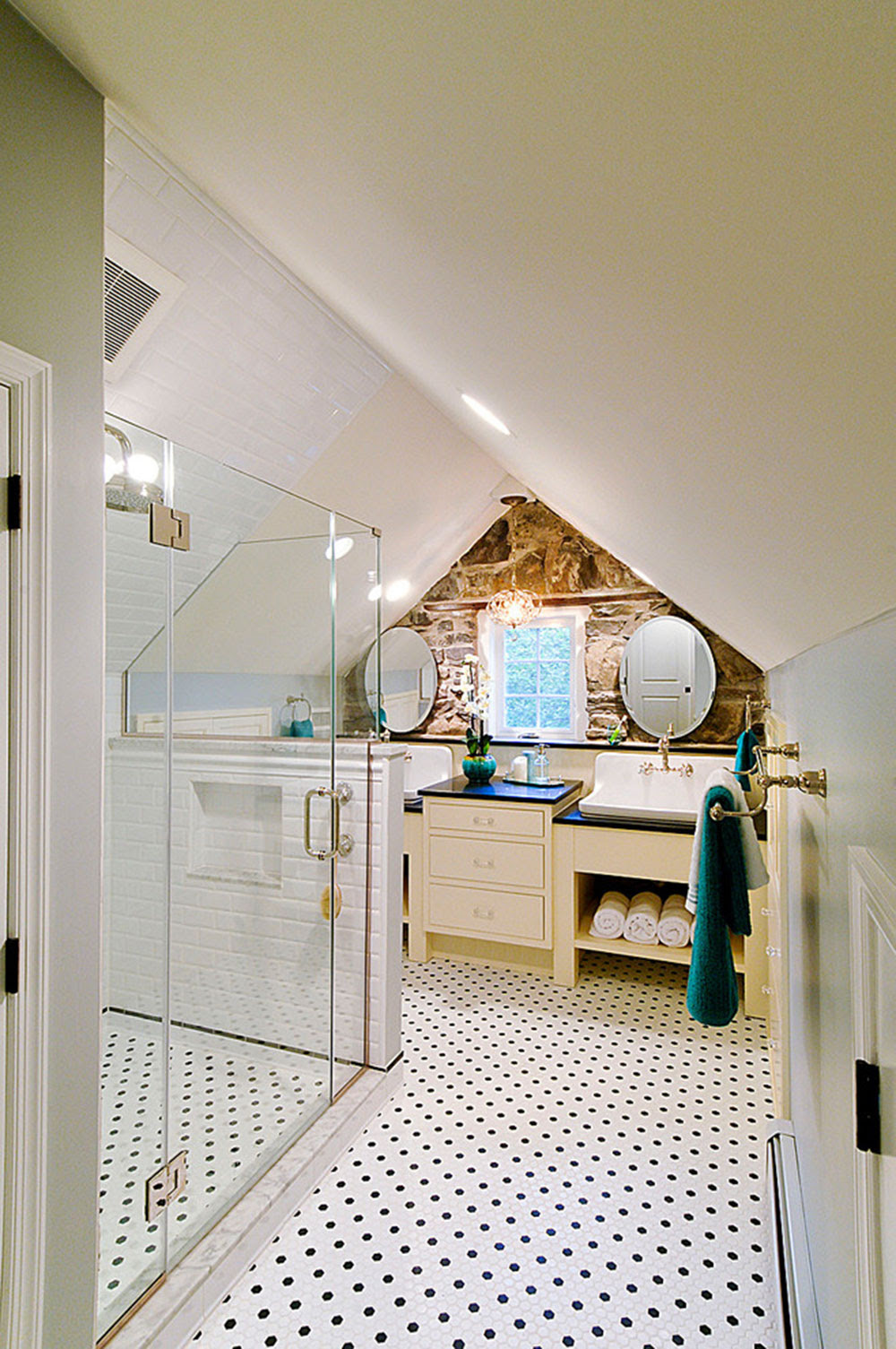 Чердак разделен на три зоны: спальню, гардеробную и главную ванную комнату.Чтобы придать ванной комнате ощущение спа-салона, были добавлены такие роскошные элементы, как глубокая ванна, душевая кабина без рамы, новый туалет (с подогревом сиденья и светодиодной подсветкой), мраморная и стеклянная мозаика и хрустальная люстра. Новое окно в крыше помогает осветить многие удобства в этой божественной ванной комнате.