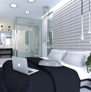 Разнообразить суровую аскетичность спальни помогут разнообразный текстиль в бежевых тонах, мягкие стеновые панели и хрустальные подвесные люстры — небольшой отход от хай-тека в сторону роскоши.