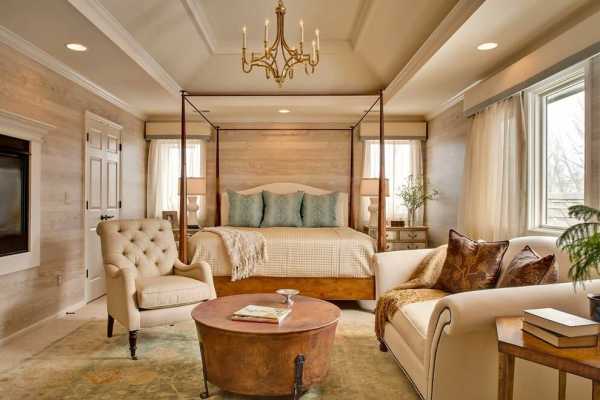 Важно правильно выбрать цветовую палитру. Выполняйте отделку в светлых тонах, чтобы подчеркнуть деревенскую направленность декора. Бежевый цвет отлично сочетается с текстурой дерева, и такой дизайн спальни даже будет напоминать скандинавский.