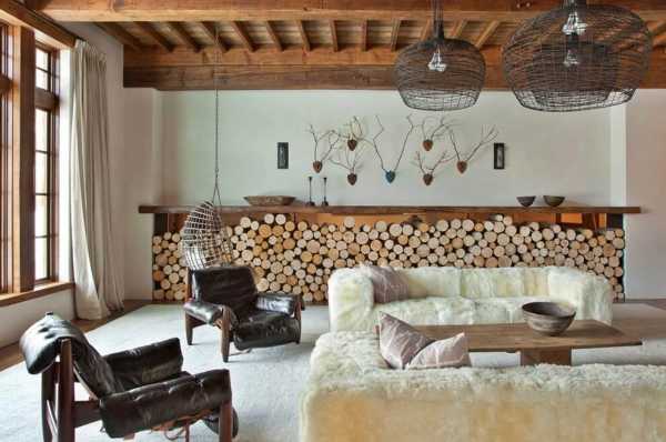 Смягчить грубоватость рустика призваны элементы декора: мягкие пуфы, ковры из меха или шерсти, изящные светильники, живые растения в доме.