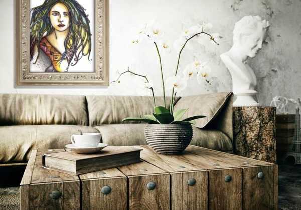 При этом на столе из дерева в первозданном виде может стоять фарфоровая ваза с цветами или аналогичный декор. Такие элементы делают обстановку более мягкой и уютной. Цвет древесины варьируется от темных до светлых оттенков. Эффектно подчеркивает течение состаренность материала.