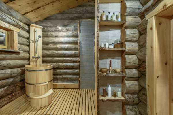На фото интерьер бани в рубленном доме, стилевое решение — рустик.