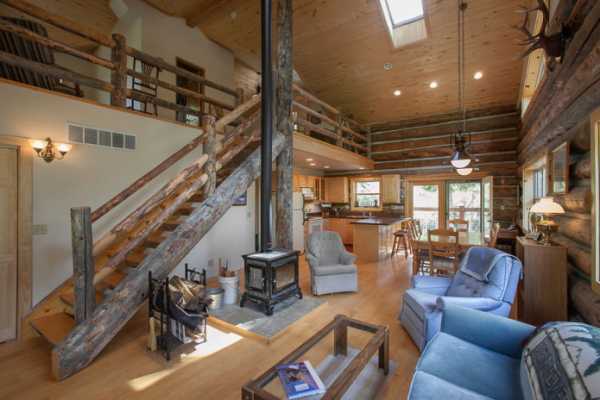 Из дерева в таком доме сделано практически всё — от потолка до пола. Наверху часто оставляют открытые балки. Причём дерево не стоит облагораживать: естественные сколы и трещины намного ценнее.