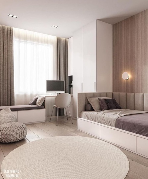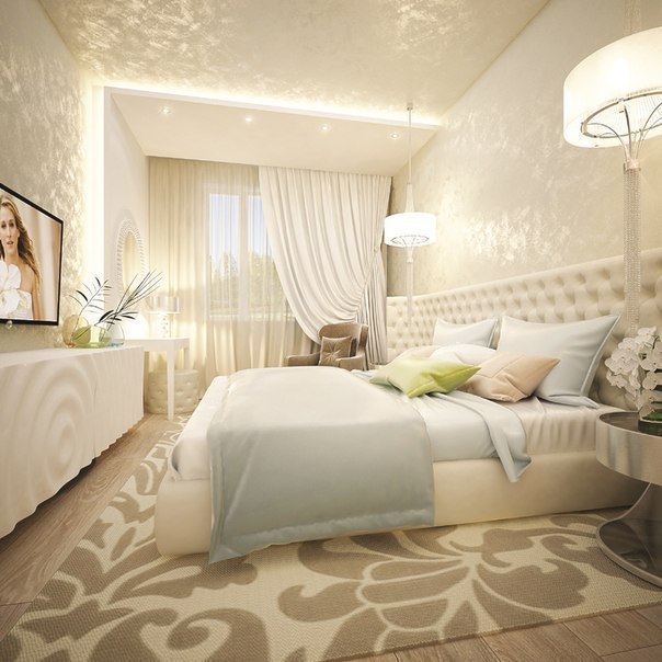 Большие спальни оформляют разнообразно, маленькие — просто. Рядом со светлой кроватью хорошо смотрятся круглые и квадратные ковры. Что касается общего фона, то идеальная цветовая гамма включает белый и песочный цвета.