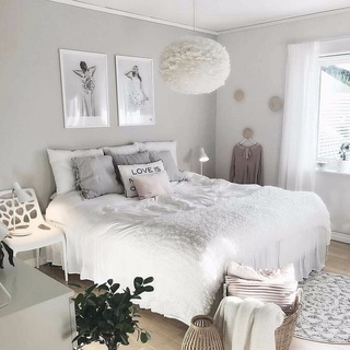 Небольшие элементы нужны в ярких тонах. Это позволит избавиться от ощущения холода в спальне. В больших комнатах по традиции кладут прикроватный коврик. Во всех светлых спальнях найдется место для настенного рисунка.