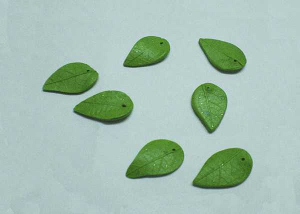 6 шаг. Теперь дело за листиками. Оставшуюся полимерную глину зеленого цвета раскатываем и с помощью формочки делаем листья. Декорировать листья с имитацией прожилок можно с помощью канцелярского ножа.