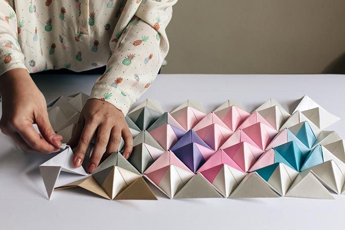 Можно использовать более сложную технику, например, оригами. Для изготовления лепестков необходимо подготовить квадраты нужного цвета и размера. Способы складывания лучше посмотреть в интернете. Важно помнить, что сгибать листы бумаги надо очень аккуратно, точно по намеченным линиям. Цветы, приготовленные с использованием техники оригами, получаются объемные. Ими можно оформить панно, открытку или брошь.
