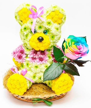 Цветочные композиции в виде фигурок мишек, зайчиков становятся все популярней. Такой подарок поразит любую молодую девушку, особенно, если он сделан своими руками. Также их изготавливают на различные праздники в детский садик. В первую очередь выбираем устойчивую основу. Это может быть любая плоская подставка, например, поднос, большое блюдо. Главное, чтоб оно не пропускало влагу.