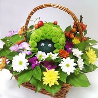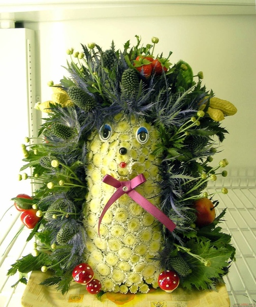 Для букета подойдут любые живые цветы, даже нераскрывшиеся бутоны. Головки отрезают и вставляют в губку по задуманному плану. Глаза, рот и нос композиции делают из подготовленных бусин, дополнительной фурнитуры. Чаще для букетов-фигур используют хризантемы. Они неприхотливы, сорта и виды представлены огромным многообразием расцветок.