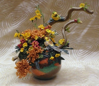 Можно делать красивые осенние экибаны из камней, сухих коряг и цветов.