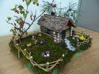 В первую очередь это касается настенных панно. Основа предложенных нами композиций – дощечка, но ее можно заменить картонкой, обтянутой тканью. Это может быть мешковина, льняная канва, домотканое полотно. Цель работы – создать определенный сюжет, это может быть деревенский домик, лесной пейзаж, река, пасека, сарайчик с дровами или небольшая повозка. На основе предложенного фото можно сделать отличные поделки из природного материала в садик, которые пригодятся не только в качестве выставочного экспоната, но и станут отличным украшением группы.