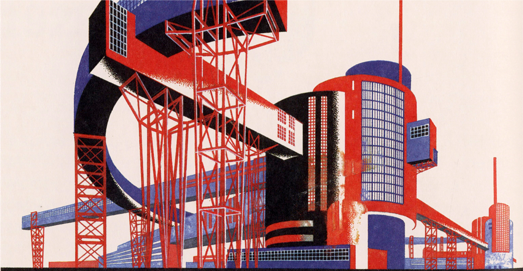 Иван Леонидов: Институт Ленина — 1927Облачное железо Эль Лисицкого — горизонтальный небоскреб для уменьшения переполненности. Его концепция заключалась в сети горизонтальных кварталов в Москве, размещенных поверх вертикальных колонн. Горизонтальные секции были бы офисами и квартирами, которые были бы связаны с транспортными станциями через вертикальные колонны. Помимо практического оправдания, Лисицкий хотел дать Москве новый очертания горизонта, чтобы заменить ее старомодное прошлое.