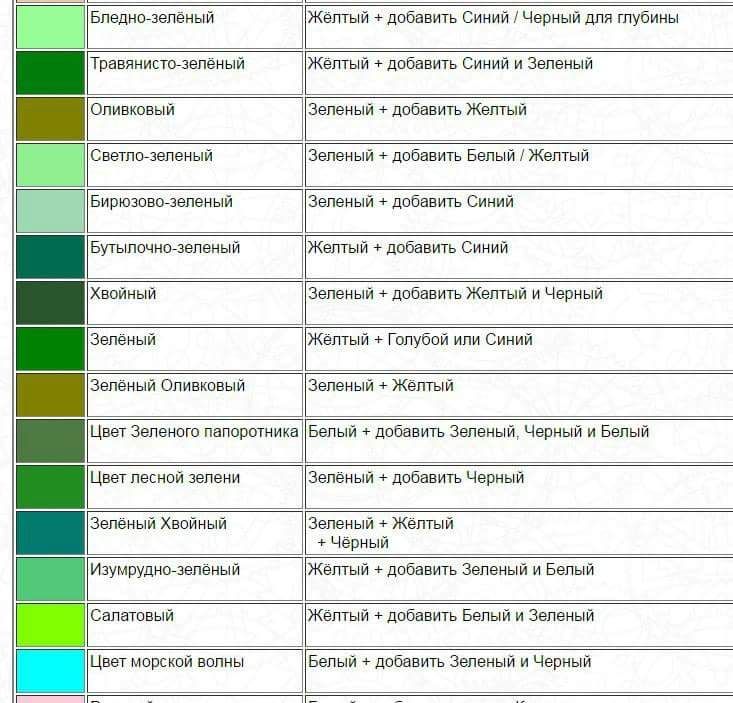 Важно вводить красный колер в зеленый, но не наоборот. Добавляют его по каплям, чтобы не испортить новый тон, превратив его в серо-коричневый, ржавый или кирпичный. Основным тут будет служить зеленый, но красный делает коричневый тон теплее.