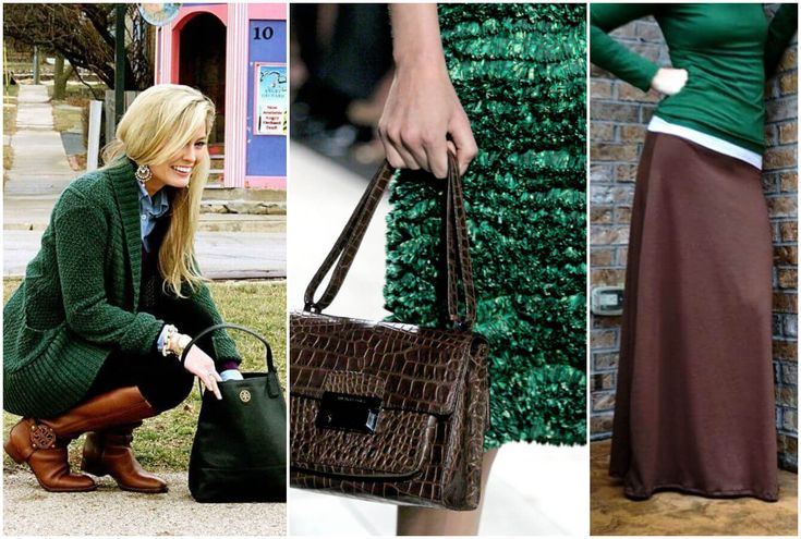 Зелёный цвет вносит в ансамбль с коричневым ощущение свежести и прохлады, которая контрастирует с тёплыми темно-бежеивыми тонами. К каждому оттенку коричневого подбирается свой тон зелёного. Сочетание таких цветов в одежде придаёт им дополнительную элегантность.