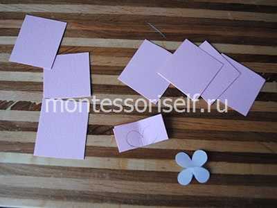 - Вырежьте детали для крышечки из скрапбумаги таких размеров: торцы крышечки – 6,9х1,3 см; три квадрата – 6,9 см.