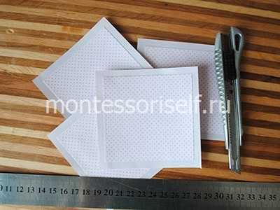 - Сделайте биговку, разделив каждый лист на 9 квадратов. Для первого листа отступите от края 10см; для второго 9,6см; а для третьего 9,3см.
